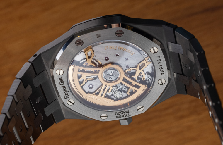 Audemars Piguet kopi bruker bulk metalliske glasspalladiumdeler til rammen, baksiden og mindre armbåndslenker. Resten av referansen 16202XT.OO.1240XT.01s koffert er i normalt utformet titan. Den resulterende klokken føles lett på håndleddet, på en sporty måte som er et kjærkomment alternativ til den også fine opplevelsen av å ha på seg en tyngre hel-gull Royal Oak-veske. Dekselet er 39 mm bredt og bare 8,1 mm tykt. Den har et flatt AR-belagt safirglass over skiven (samt caseback) og er vanntett ned til 50 meter. Passformen og finishen er imponerende, og som Royal Oak har gjort gjennom årene, imponerer den virkelig på håndleddet.