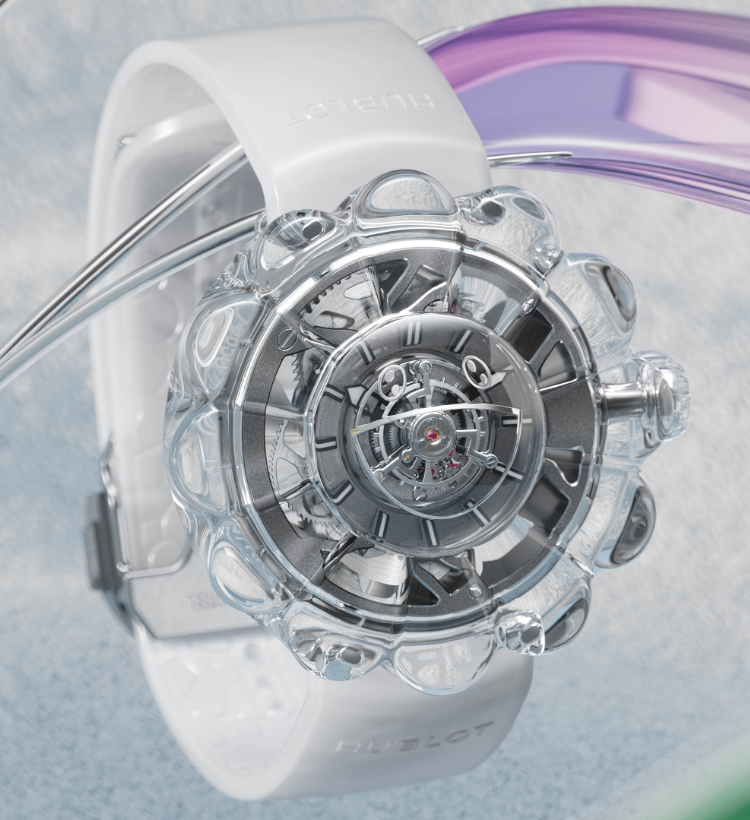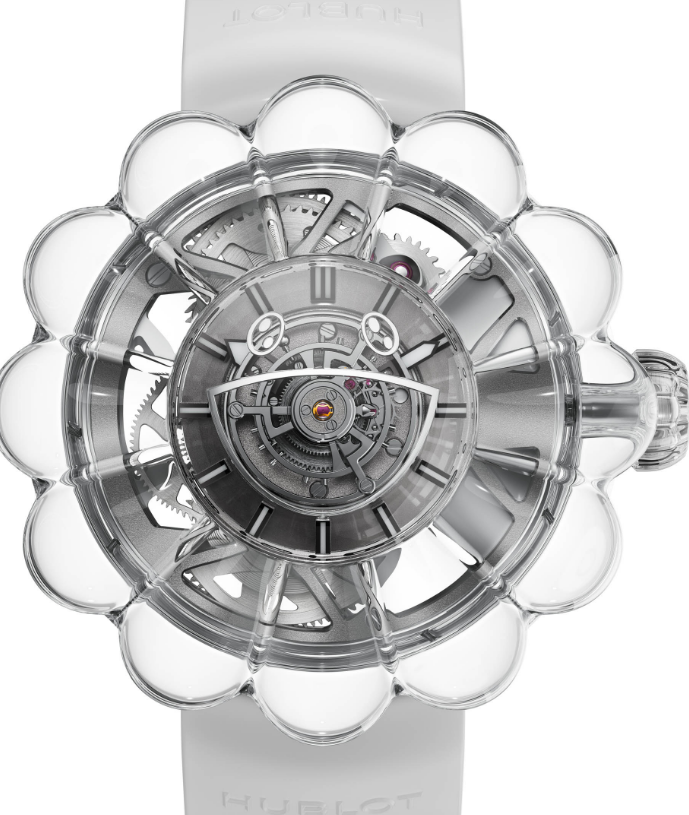 Normalt ville vi ikke se gjentakelser av de forskjellige merkenes Only Watch-nyheter før etter at veldedighetsauksjonen allerede hadde funnet sted, men med Only Watch 2023 utsatt foreløpig, lanserer Hublot kopier klokker en kommersielt tilgjengelig variant av den uvanlige Only Watch-delen. Mens den stykke-unike Hublot MP-15 Takashi Murakami Only Watch Sapphire inneholdt et blomsterformet safiretui utstyrt med kronblader utsmykket med 444 regnbuefargede edelstener, har den nye Hublot MP-15 Takashi Murakami Tourbillon Sapphire sine blomsterblader laget av klare blader. .