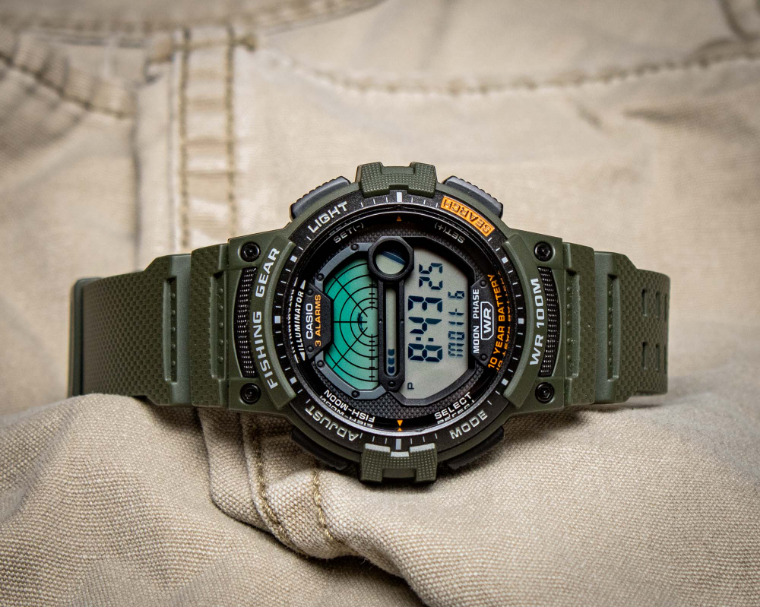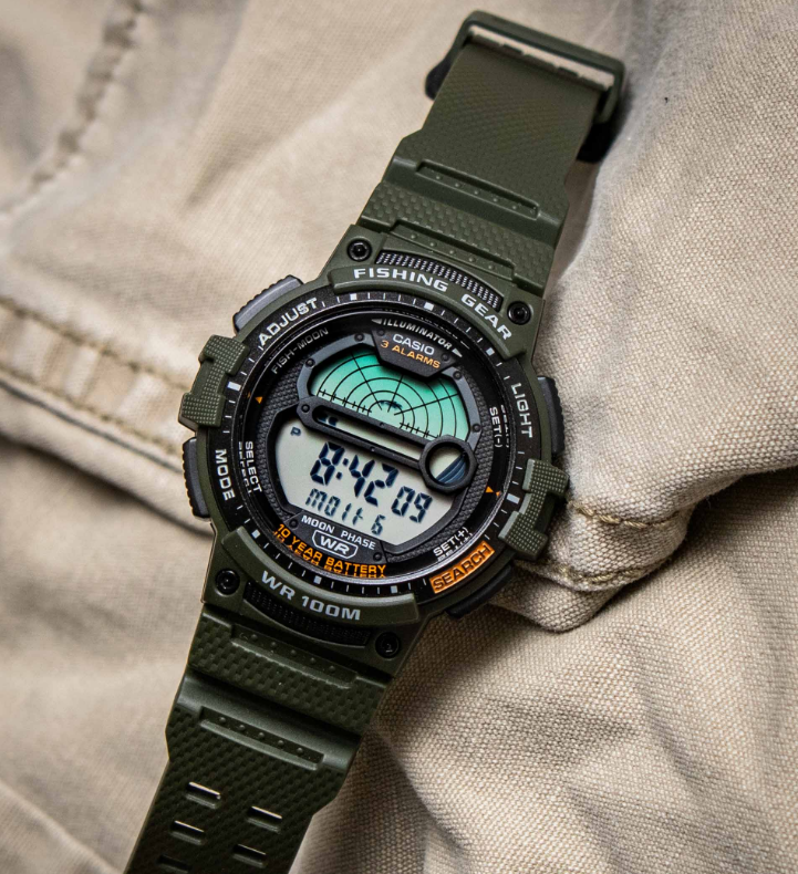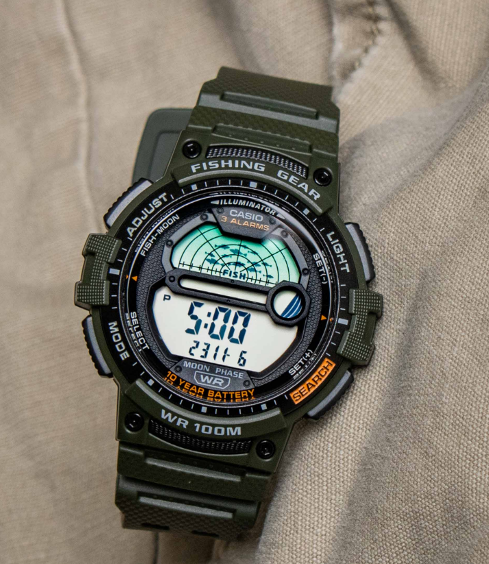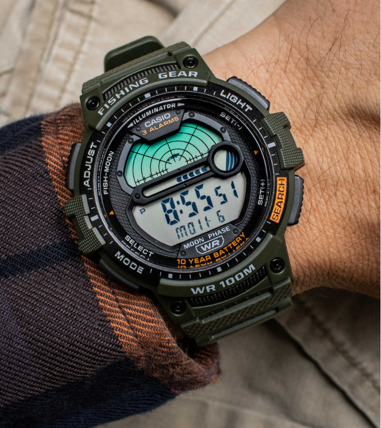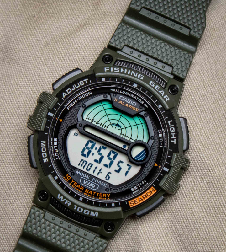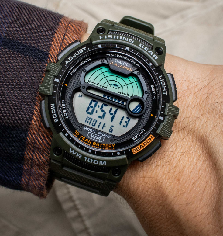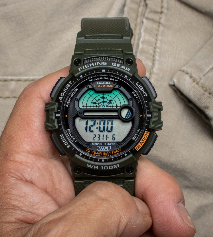 Selv om Casio Fishing Gear WS1200H-klokkene inkluderer en elektronisk bakgrunnsbelysning som kan aktiveres ved å trykke på knappen øverst på høyre side av dekselet, er ikke bakgrunnsbelysningen den elektroluminiscerende stilen som du finner på avanserte modeller som de fra merkets G-Shock-serie, hvor hele skjermen lyser opp hver gang den aktiveres. I stedet har Fishing Gear WS1200H-modellene en enkel oransje LED-bakgrunnsbelysning som asymmetrisk lyser opp skjermen fra venstre side av skjermen. Likevel tilbyr den svart-på-grå positive LCD-skjermen rikelig med kontrast og lesbarhet, og modellens signaturfiskesporingsradarskjerm gir klokkene et morsomt og unikt utseende som i utgangspunktet ser ganske taktisk ut helt til du legger merke til de små fiskeformene som med jevne mellomrom vises innenfor den.