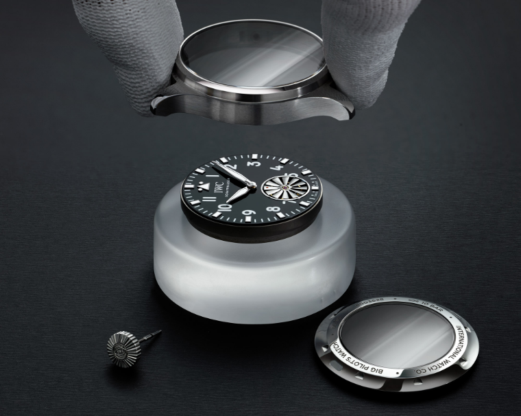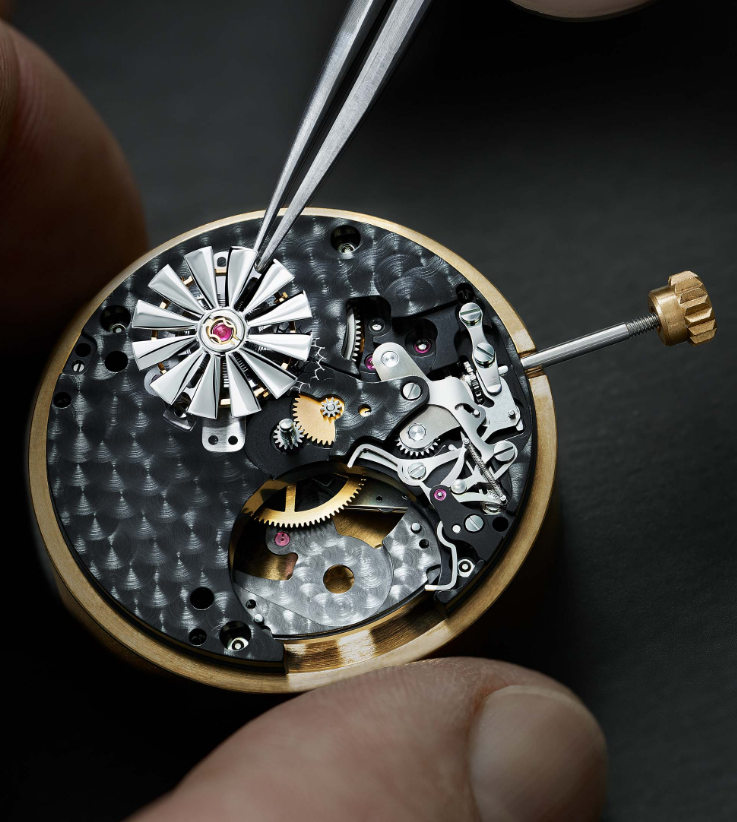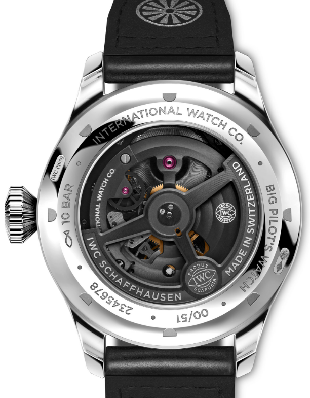 Den ekstra vekten kommer selvfølgelig fra titanturbinen. For å gjøre monteringen enda lettere delegerte Markus Bühler og teamet hans ytterligere funksjonalitet til den: Turbinen fungerer nå som den øvre delen av tourbillon-buret og erstatter regulatoren, så nå festes hårfjæren til undersiden av en av turbinens blader, noe som gjør det mulig for urmakeren. å justere nullkryssingen av balansen ved å snu turbinen. Dette sparer betydelig vekt sammenlignet med å ha en komplett tourbillon med alle disse essensielle komponentene på plass og slå en metallturbin på toppen.kjøpe falsk klokke IWC 82905-kaliberet inne i IWC Big Pilot’s Watch 43 Tourbillon Markus Bühler-klokke har en gangreserve på 80 timer, fylt opp av et Pellaton-viklingssystem forsterket med keramiske komponenter, og viser svarte PVD-belagte, lasergraverte og rhodiumbelagte deler gjennom en safirkrystall-deksel.
